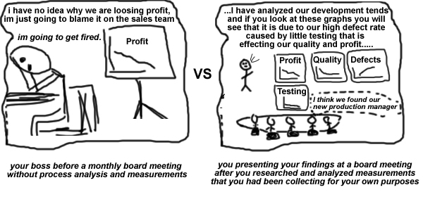 It is always easier to explain your point to upper management when you have actual data and visuals such as charts that can be analyzed and used to substantiate your point; this is where measurements come in. Measurements themselves can be a complex and important tool that can be used in process improvement models such as CMMI, but it is not until level 2 and 3 (in CMMI) that you actually get to make use of those measurements. At some point (idea for another post) I will discuss how quick and dirty measurements can be put in place without too much of a hassle (and measure process without process). Not everyone is a “process” person and fail to understand the importance of process (and a formal SDLC).