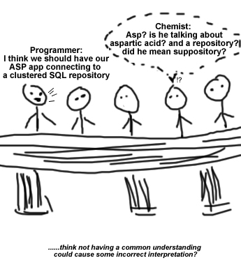 Common Language: Recently I worked on a project where I was using the phrase “data entry” to describe an action where “any user enters data using a graphical user interface”. One of the team members was having a very hard time following the discussion because to him “data entry” was specific to “data entry personnel” (people hired to do data entry), who used a specific data entry user interface that was different than the user interfaces used by others, this was because they didn’t need the pretty features as all they did was repetitive data entry. This is why it becomes very important that the team members have a common mental model and have developed a vocabulary that is understood by all as this helps develop a working culture where misunderstandings or unclear terms will be kept to a minimum.
