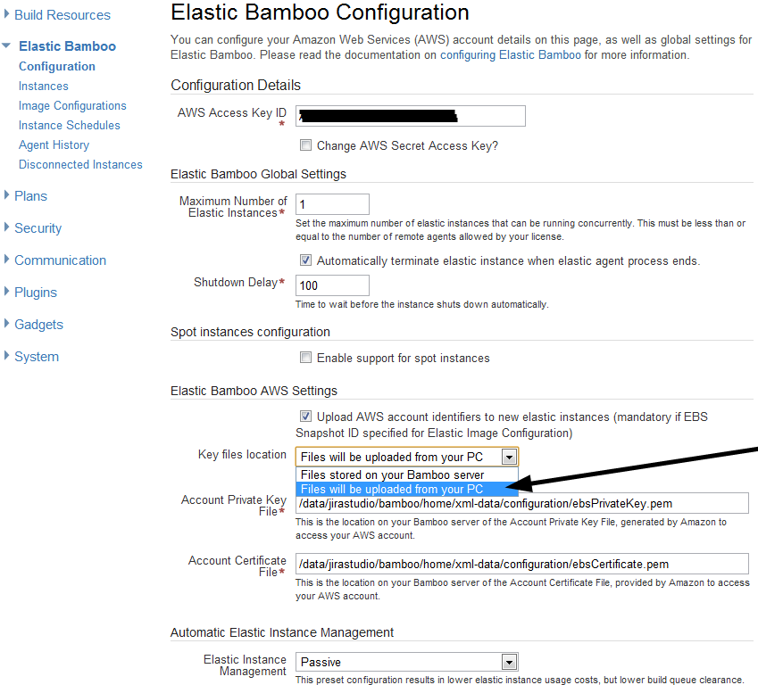 You will need to enter your AWS Access Key, I changed the shutdown delay to 100, and I opted to enable “Upload AWS account identifiers to new elastic instances.” I don’t think this is actually needed for windows systems (doesn’t work)., but the thought here was that you could start an elastic instance and have it “mount” a specific elastic volume…. this does not work in bamboo for windows systems., but whatever, if you look at the image, you will need to select “files will be uploaded from your PC” and then you can upload your cert key pair; it then uploads and saved it for you. I also opted for Automatic Elastic Instance management, and sent it to passive.. You can change these values if you will be doing a lot more builds; but for starting out and getting things going, the minimum is just fine.