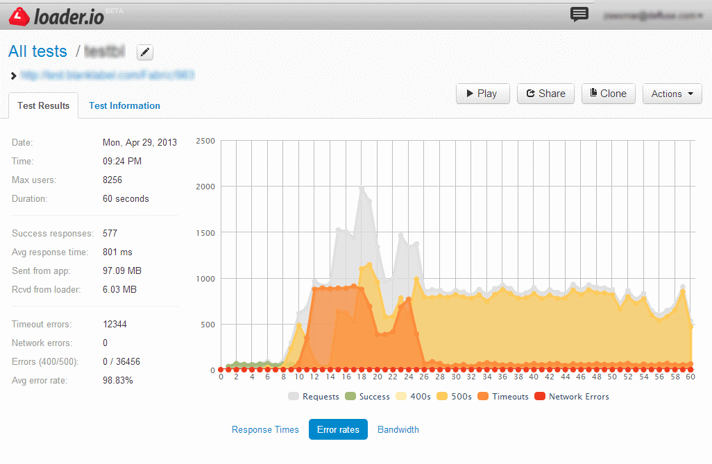I play with shiny toys every now and then, and recently my shiny toy is loader.io; while blanklabel has been using sendgrid for sending its order confirmation emails since 2010 to users (who eagerly await them). So, what did I gain from using loader.io today? Compared to the other day where I had no problems with a 10k hit (vising 1 static URL); today I tried to hit it with 50k hits, 3 heavy urls per connection… and below are the results.