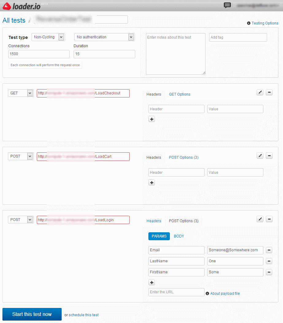 Using loader.io we are able to create a test that will first hit LoadLogin then LoadCart and then finally LoadCheckout; in each case passing values. Below is a simple screenshot that illustrates this simple test.